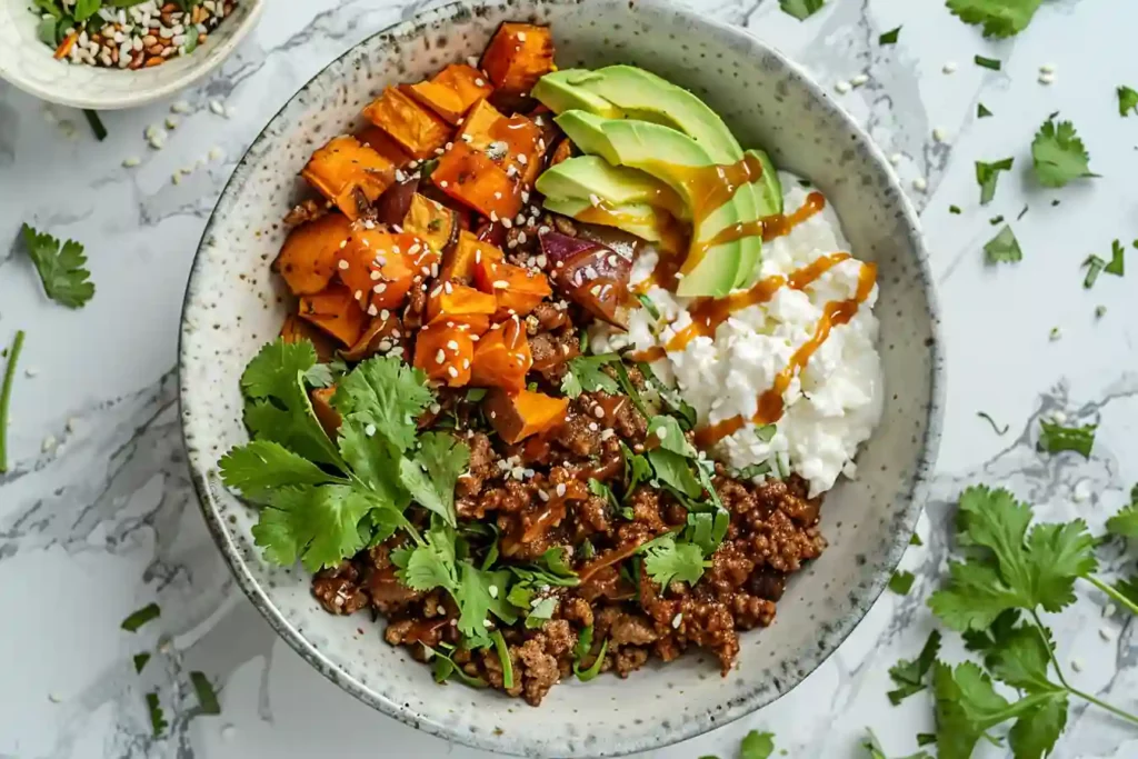 Let’s talk numbers without turning this into a math test. The sweet potato cottage cheese taco bowl brings serious macro balance. You get complex carbs from sweet potatoes, lean protein from ground beef and cottage cheese, and healthy fats from toppings like avocado or seeds. All that in one bowl that’s low in sugar, high in flavor, and wildly satisfying.